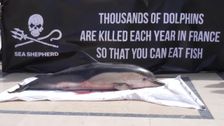 Aktivist:innen protestiert in Paris mit einem toten Delfin gegen Beifang und fordern strengere Kontrollen. Trotz Fangverboten sterben jährlich tausende Tiere in Fischernetzen.