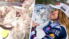 Mikaela Shiffrin feiert ihren sechsten Sieg im Gesamtweltcup ausgelassen und zerstört dabei eine ihrer Kristallkugeln.