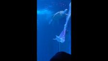 China: Chinesische Meerjungfrau-Darstellerin von hartnäckiger Meeresschildkröte im Aquarium bedrängt