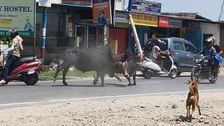 Gefährliche Szenen im indischen Bundesstaat Westbengalen: Zwei Bullen trugen ein Duell auf einer Straße aus. Ein Motorradfahrer und sein Beifahrer gerieten mitten in den Kampf.