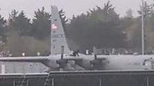 Ein Mann klettert auf einer Maschine der US-Luftwaffe herum und schlägt mit einer Axt darauf ein. Nur wenig später kann er festgenommen werden.