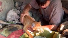 Chamai Parawat hörte das Wimmern des verzweifelten Hundes und entdeckte ihn unter Felsen in Nakhon Sawan, Thailand. Chamai vermutete, dass es seit drei Tagen nichts essen konnte. Der Welpe, der an einer Darmerkrankung litt, erholt sich jetzt, nachdem Chamai ihn adoptiert hat.