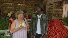 Bettina (57) ist in Uganda mit ihrem 27 Jahre jüngeren Denis auf der Suche nach dem perfekten Mitbringsel für seine Mama. Auf dem Markt ist die Auswahl groß – und es wird exotisch.