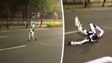 Peinliche Momente filmte ein Passant bei Übungen für einen Roboter-Marathon in Peking. Ein Humanoid kam während seines Laufes ins Straucheln und legte einen dramatischen Sturz hin. Über 100 Roboter nehmen bei der Veranstaltung dieses Wochenende teil.