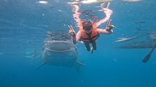 Eine Schnorchlerin erschrak, als ein Walhai in Cebu, Philippinen, mit ihr zusammenstieß. Walhaie sind im Allgemeinen sanftmütig und nicht aggressiv, ernähren sich typischerweise von Plankton und stellen für den Menschen kaum eine Gefahr dar.