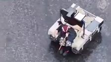 Dies ist der Moment, als ein außer Kontrolle geratener Kleinlaster über einen Hof raste, bevor er in Liaoning, China, gegen eine Absperrung krachte. Aufnahmen einer Überwachungskamera vom 5. April zeigen einen Landwirt, der an einem Lastwagen arbeitet, als dieser plötzlich über den Hof beschleunigt. Es wurden keine schwerwiegenden Verletzungen gemeldet.