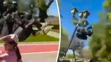 Dramatische Momente filmten Augenzeugen auf einer Promenade der nordmazedonischen Stadt Ohrid. Ein Paraglider näherte sich gefährlich nahe den Fußgängern. Plötzlich verliert der Pilot des Tandemflugs die Kontrolle und kracht mit seinem Passagier in eine Laterne. Nur um Haaresbreite entgingen Passanten einem Unfall. Das Video wurde Ende April veröffentlicht. Von wann die Aufnahmen stammen, ist unklar.