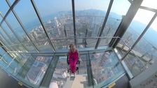 Ein Rollstuhlfahrer erlebte einen gläsernen Skywalk in fast 250 Metern Höhe über der Stadt an einem Turm in Penang, Malaysia. Auf den Aufnahmen ist zu sehen, wie Vahen King lächelt, während sie und ihr Ehemann auf dem transparenten Steg stehen und den Blick über die belebten Straßen schweifen lassen. Das Paar besuchte den Rainbow Skywalk, einen der höchsten gebogenen, offenen Glasstege der Welt.