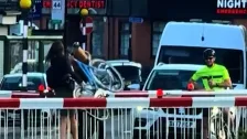 Das Filmmaterial zeigt eine Frau in Netherfield, Nottingham, die am 6. Oktober 2025 ihr Fahrrad über geschlossene Bahnschranken trägt. Martin Greenwood filmte, wie sie sich abmühte, das Fahrrad über die Barrieren zu heben, während ein Zug in der Nähe war. Andere Radfahrer an der Kreuzung schienen von ihrem Verhalten schockiert zu sein.