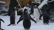 Ganz in ihrem Element: Zoo-Pinguine spielen im Schnee