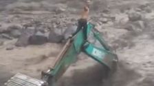 Schwere Wassermassen haben einen Baggerfahrer in Indonesien überrascht. Dieser konnte sich gerade noch auf den Baggerarm retten und in Sicherheit bringen.