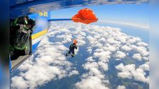 Fallschirmspringer baumelt in 4.500 Metern Höhe an Flugzeug