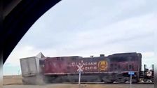 An einem Bahnübergang in Alberta, Kanada, hat ein Zug einen Sattelschlepper bei voller Fahrt gerammt.