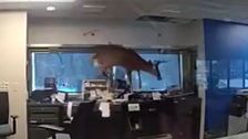 Ein Rehbock war über ein Fenster in eine Bankfiliale gelangt. Dort raste er panisch zwischen den Möbeln herum und verursachte Chaos. Die Polizei konnte ihn ins Freie führen.